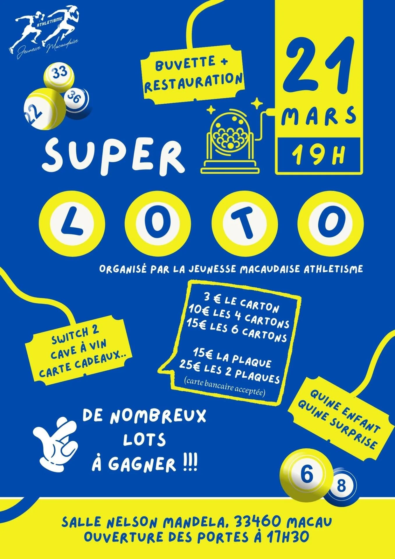 La Jeunesse Macaudaise Athlétisme vous propose son Super Loto le samedi 21 Mars 2026 à la salle Nelson Mandela, 33460 Macau
